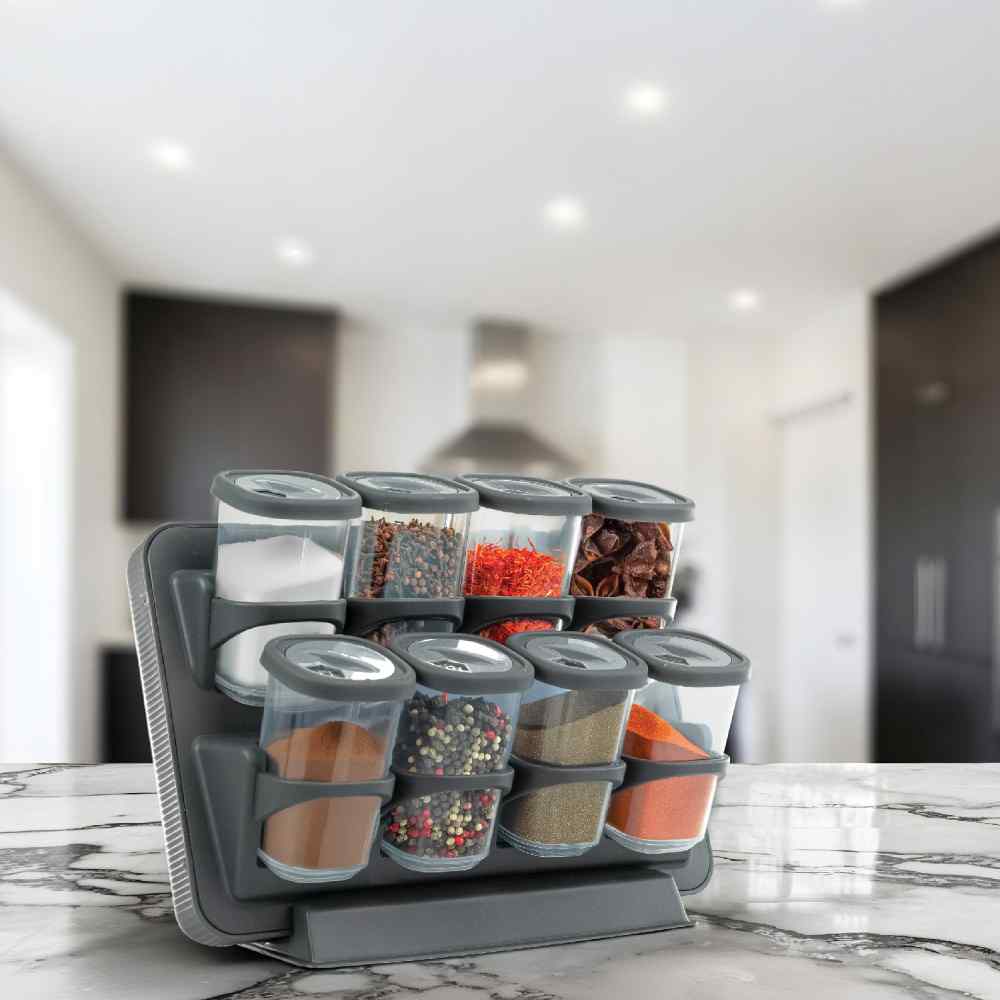 طقم كامل من علب التوابل مع ستاند متناسق، مصمم للحفاظ على تنظيم المطبخ مع الحفاظ على الطزاجة والنكهة